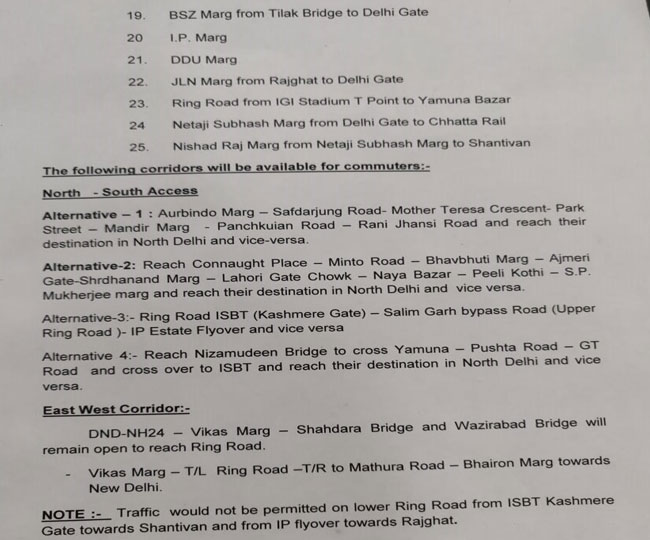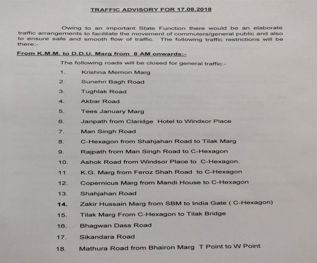 एडवाइजरी के मुताबिक, कृष्णा मेमन मार्ग, सुनहरी बाग रोड, तुगलक रोड, अकबर रोड, तीस जनवरी मार्ग, क्लेरिज होटल से विंडसर प्लाजा के बीच जनपथ, मानसिंह रोड, शाहजहां रोड से तिलक मार्ग सी-हैक्सा